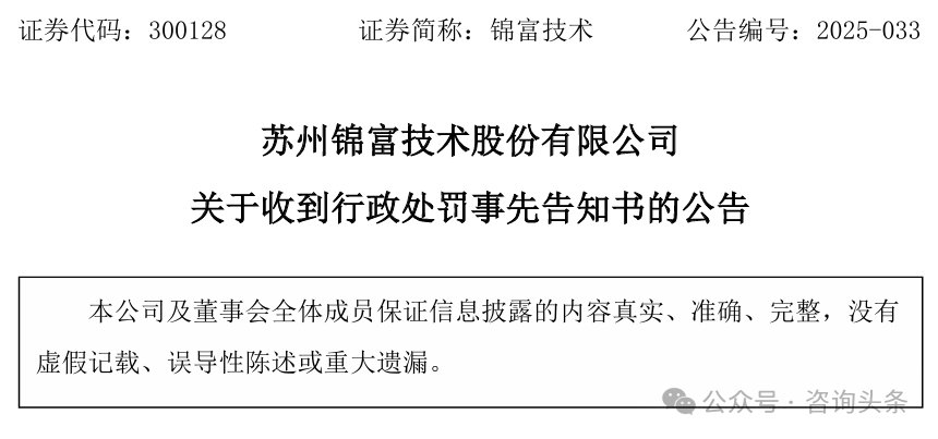 2025年5月30日,深交所创业板上市公司锦富技术(维权)(证券代码:300128)发布《苏州锦富技术股份有限公司关于收到行政处罚事先告知书的公告》。公告显示,该公司于2024年8月2日收到中国证监会下发的《立案告知书》(编号:证监立案字0102024019 号),因公司涉嫌信息披露违法违规,中国证监会决定对公司立案。
