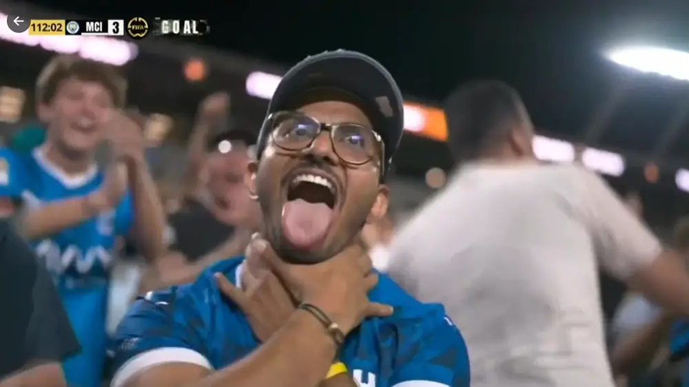 有意思的是,此时直播镜头转向看台上的沙特利雅得球迷,只见一位球迷做出双手掐脖+吐舌头的动作,接着一个歪头,象征着被掐死,以此来嘲讽曼城的输球。