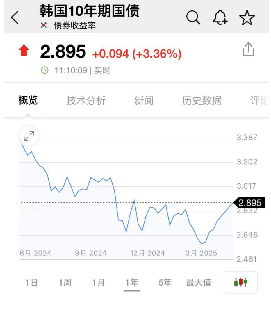 韩国十年期国债收益率上涨94个基点,报2.895%。
